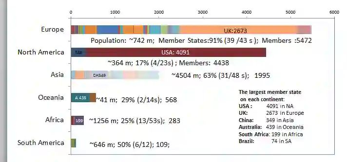 2018年9月我做了两组数据分析:即对成立于1997年的国际出版伦理委员会(COPE)12100多家会员在6大洲,92个国家的分布与各大洲的人口做了个比较(图1),会员最多的国家分别为美国4091;英国2673;澳大利亚439;中国349;南非199,巴西74。这个数据说明,在人口最多的亚洲(45.4亿人口)中,中国作为人口最大国家,学术期刊也是世界体量最大的群体近7000多份(科学期刊5020;社科期刊1918 ),会员只有区区349家,在这个学术伦理的共同体中,说明了什么?