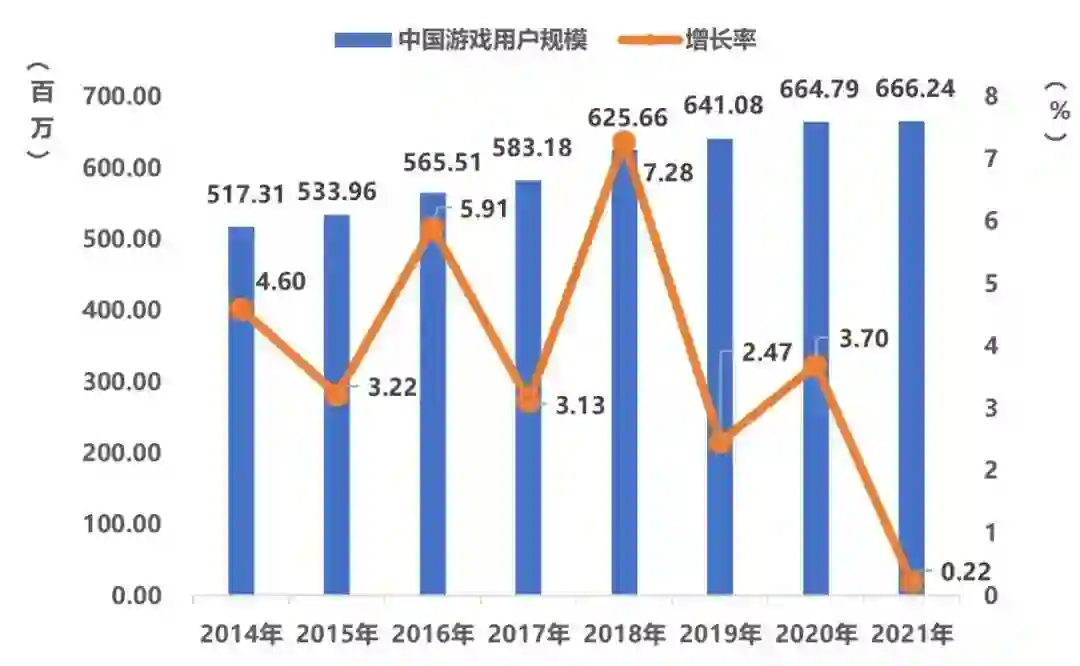 简单来说,国内市场的游戏用户红利已经基本摸到了天花板。游戏工委的数据显示,2021 年,中国移动游戏用户渗透率接近 100%。去年中国游戏用户规模达 6.66 亿人,同比仅微微增长 0.22%。前几年,虽然用户增长缓慢,但是用户规模每年大多还是以千万级增长,而去年的增幅与 2020 年相比,用户规模变化不大。