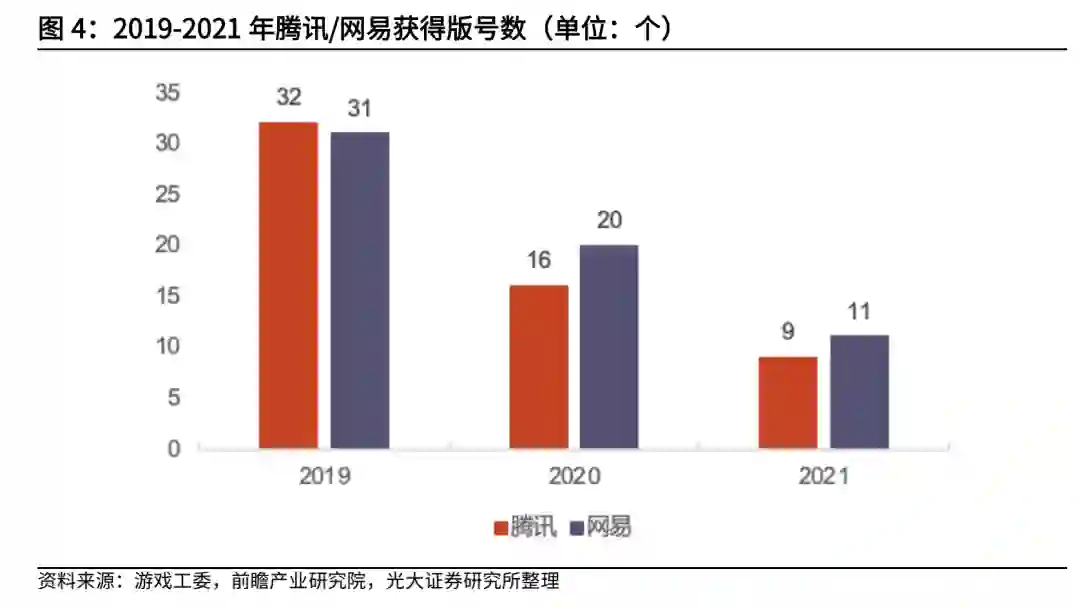寒冬之后,行业集中度必然提升,缺少了新的活水,版号库存量大的头部游戏公司“强者恒强”。2019-2021 年,腾讯分别获得 32/16/9 个版号,且在 2021 年的 9 款过审游戏中,7 款来自进口,知名度普遍较高,如《英雄联盟手游》《哆啦 A 梦牧场物语》,国内原生游戏仅有 2 款。网易的情形与此类似。