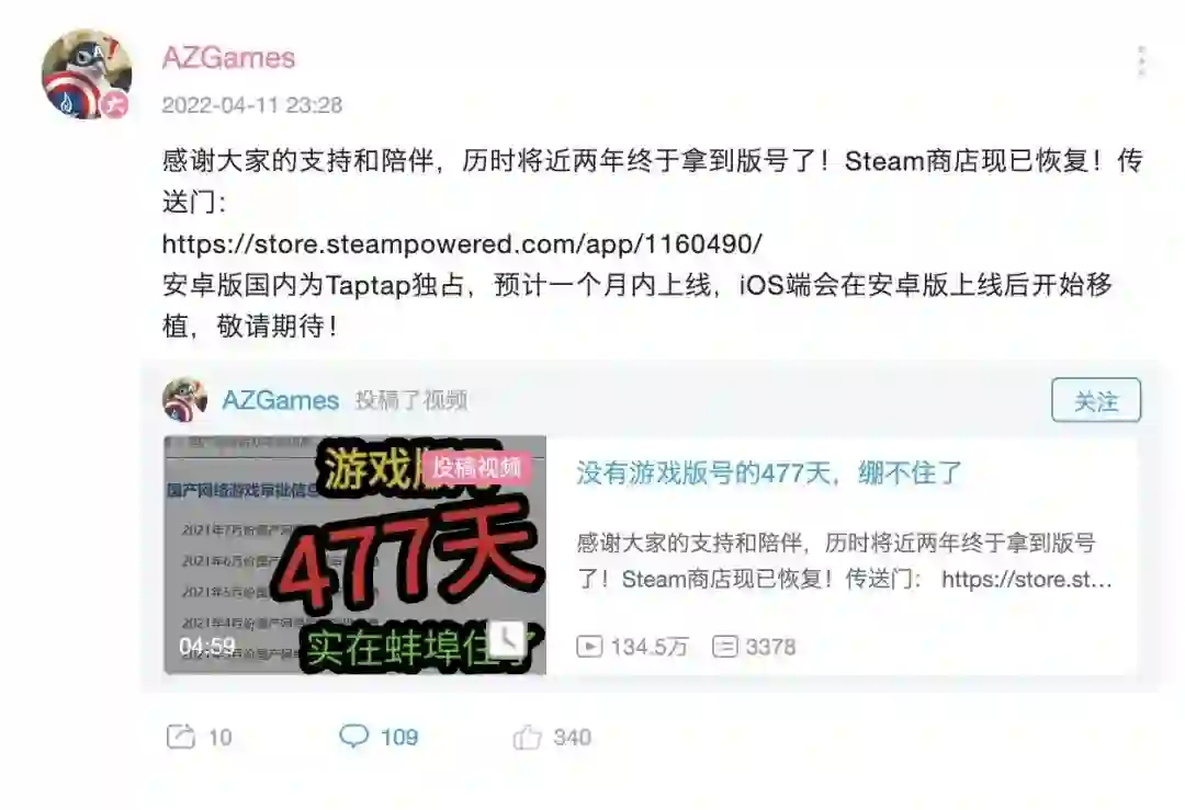 2021 年 12 月 25 日,独立游戏制作人@AZGames 在 B 站发布了一条视频,名为《没有游戏版号的477天,绷不住了》。这条视频讲述了他制作的游戏《陶艺大师》长达 477 天的艰难送审经历,并在 B 站获得了 134.4 万播放量。