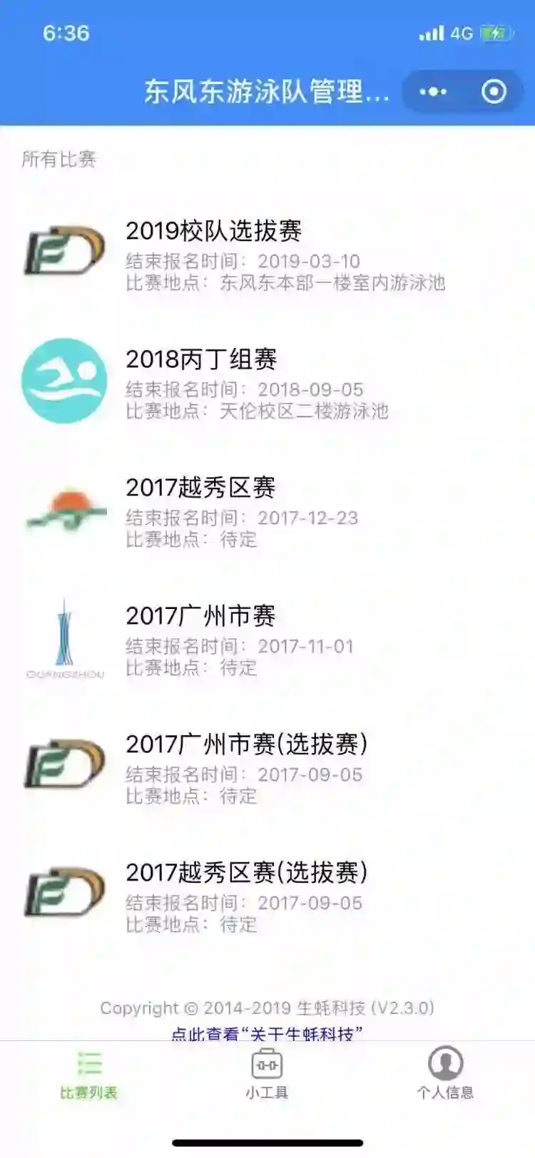 2017 年 6 月,小生蚝第一次接触上线不久的小程序,而在沉迷编程无法自拔之前,小生蚝其实是个运动少年。读小学的时候,他曾是学校“东风东游泳队”的成员,毕业后,他也持续关注着学校游泳队的发展。然而小生蚝发现,游泳队在比赛报名、成绩计算、议程通知等方面效率很低、非常不方便,组织起活动也难度很大,于是,他决定为母校做点贡献。
