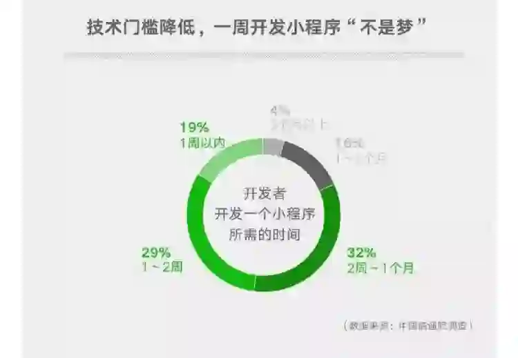 微信本身所具备的低门槛、易开发使其成为编程教育的优质工具。据中国信通院统计,有近五成小程序能在两周之内完成,开发和上线难度远远小于 App,却能实现和 App 不相上下的强功能。