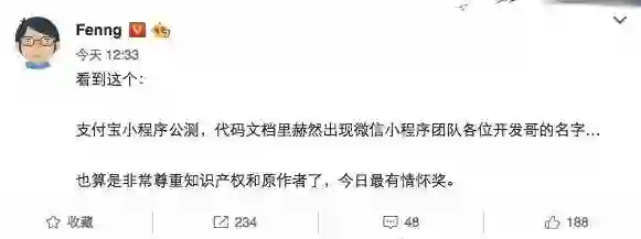 不过,在支付宝小程序公测的今天,却发生了一件尴尬的事。有人在支付宝小程序代码文档里发现了微信小程序开发团队的名字,因此网传支付宝小程序的代码“抄袭”微信小程序。知名大 V 冯大辉发了一条微博表示: