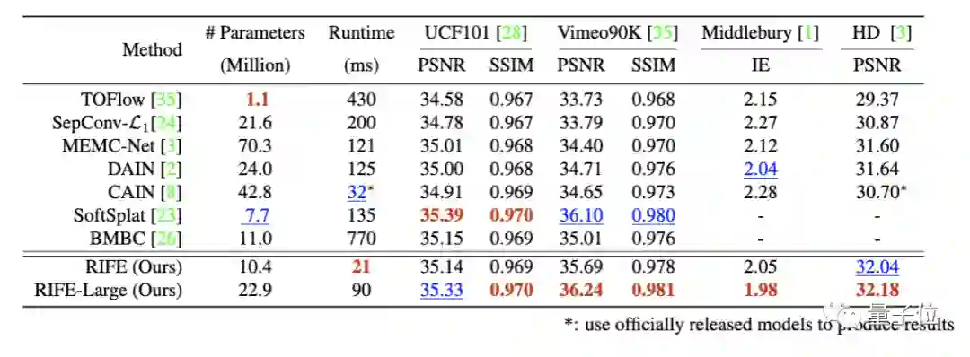 研究人员在UCF101、Vimeo90K、Middlebury OTHER set和HD benchmarks等基准上,将RIFE与英伟达的SoftSplat、上交大的DAIN等「前辈」进行了对比。