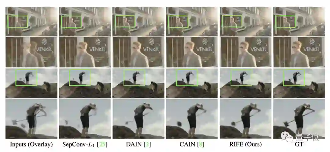 可以看到绿框部分,SepConv-L1和DAIN产生了伪影,而CAIN铲子部分则出现了缺失,相对而言,RIFE生成的结果更为可靠。