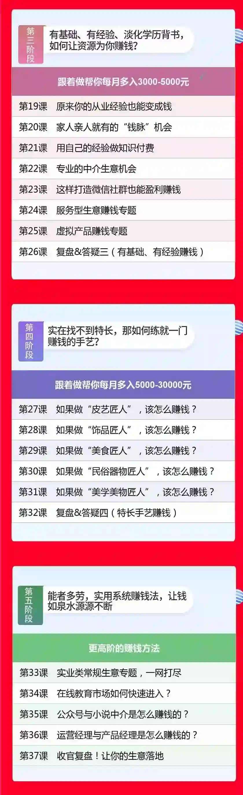 跟着他学,你很快就能找到自己的赚钱愿景,分析清楚自身目前情况,找准市场需求,并结合你的资源,最终利用业余时间达到3000到5W+的业余收入!