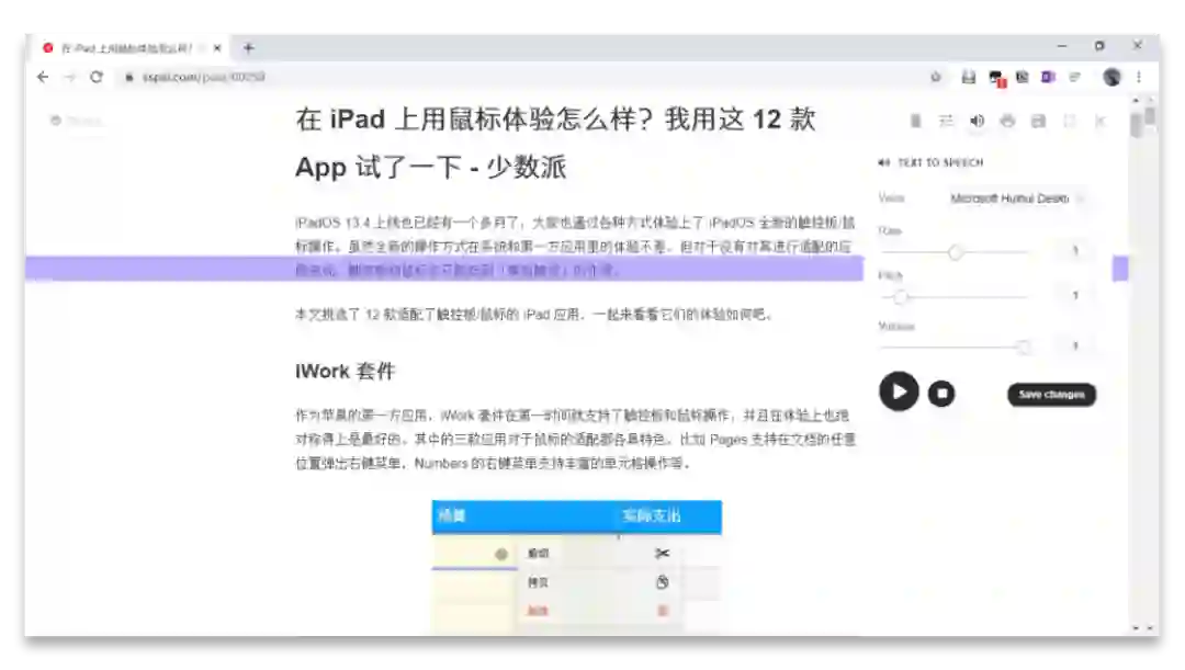 在Reader Mode 的阅读模式下,你还可以点击右上角的垃圾桶图标,手动隐藏不想要的页面元素。如果是图片等常见的元素,你可以直接在设置的「Reader Components」里关闭。值得一提的是,Reader Mode 对于无障碍操作的支持非常优秀。插件不仅为有阅读障碍的用户提供了阅读标尺来提升阅读流畅度,还支持 TTS 文字转语音功能,可以直接将文章读给你听。