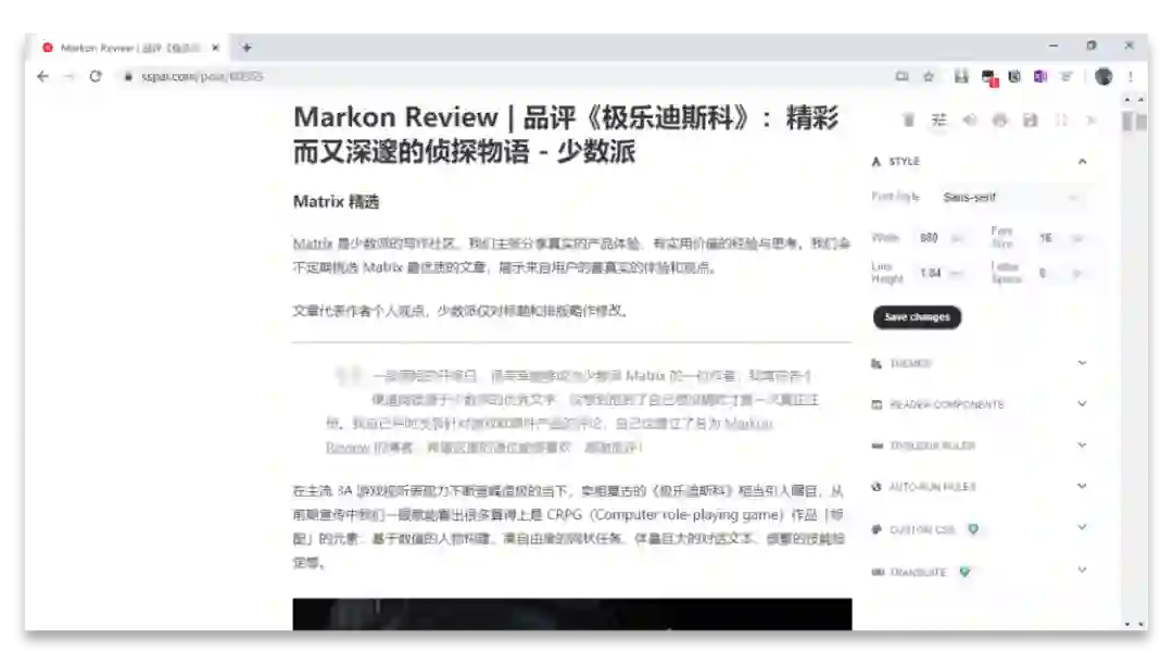 Reader Mode 最大的亮点就在于它支持对阅读模式进行相当全面的自定义设置,从字体大小、行高等常规设置,到自动进入阅读模式、自定义 CSS 等高级设置一应俱全。可以说,只要你看起来舒服的页面格式,Reader Mode 都能帮你做出来。
