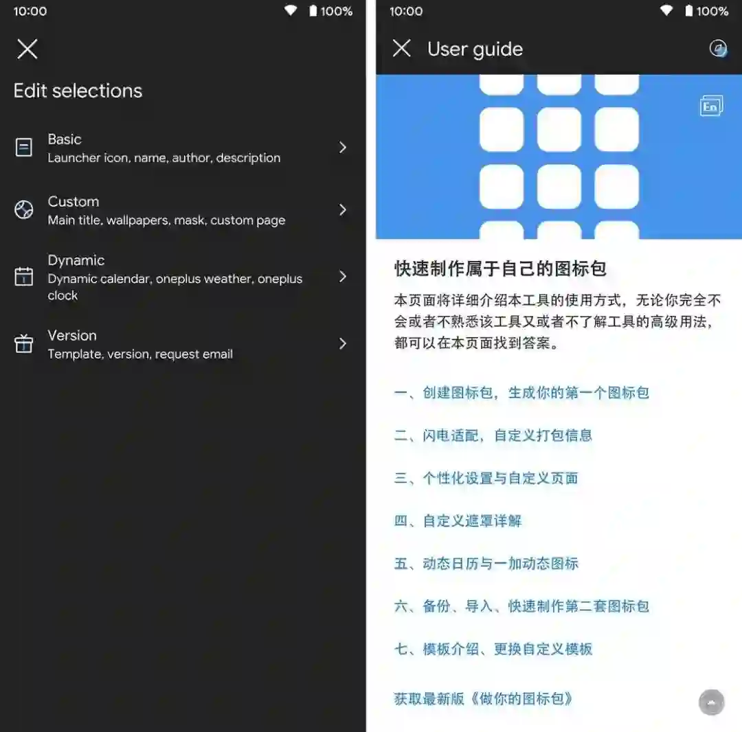 当然,以上仅展示了粗略的制作步骤,做你的图标包还能够为图标包添加遮罩、壁纸等,甚至支持用户适配动态日历图标与一加的动态天气图包,具体的使用教程在应用中已经给出,如果你想要亲自动手制作一个独一无二的图标包,不妨参照教程开始吧。