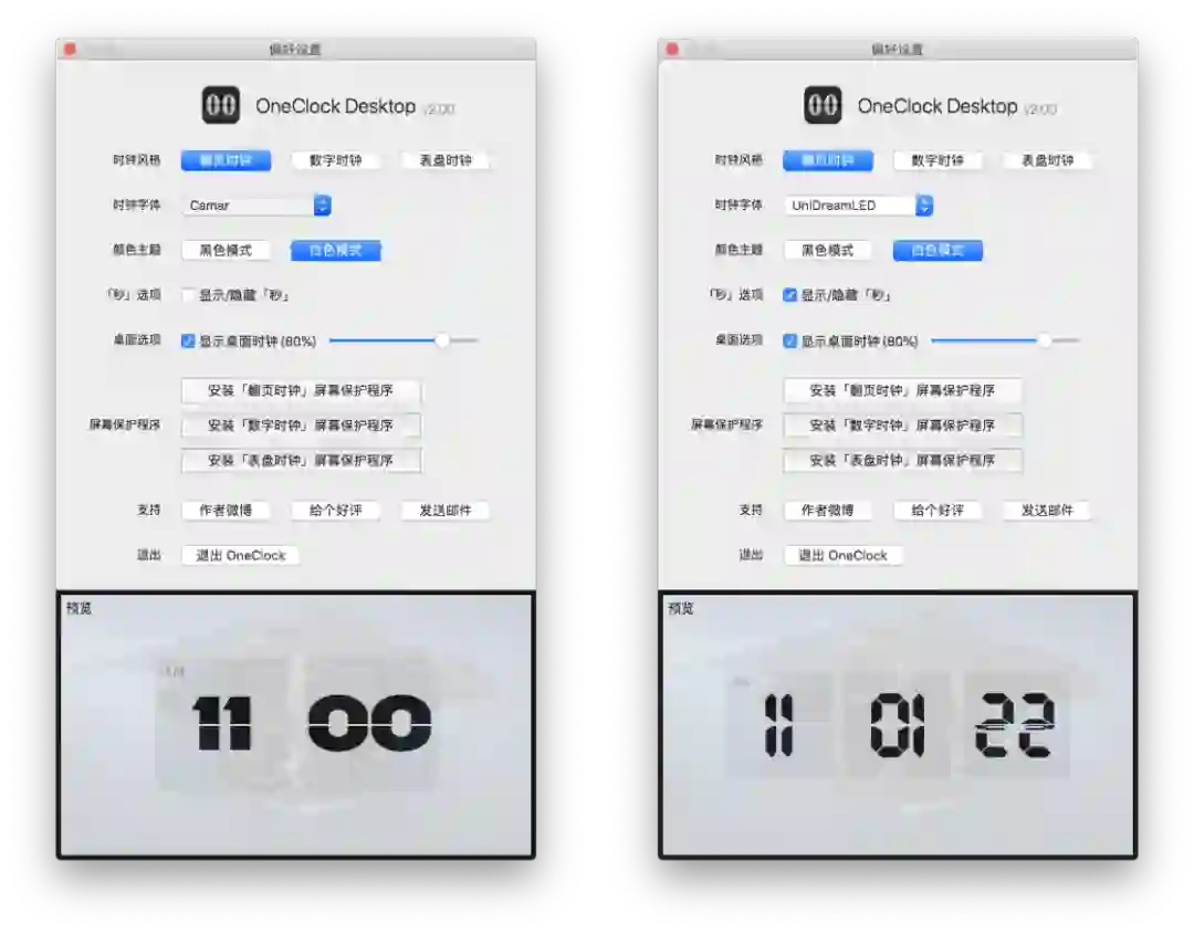与 Fliqlo 一样,OneClock 也是一款支持 macOS 和 iOS 平台的时钟屏保工具,在近期推出的 2.0 版本中 iOS 版本增加了秒数显示以及音效开关,并对时钟样式进行了优化;macOS 版本则进行了重新设计,新增桌面时钟、屏保等,还支持了更多表盘、主题、字体等样式方面的设置选项。