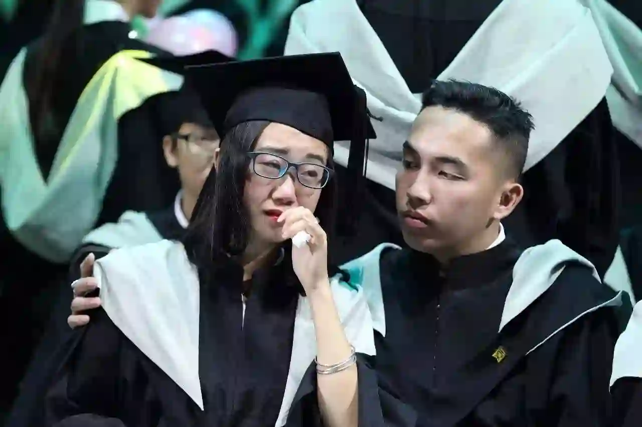 毕业典礼现场,汕头大学全体师生合唱的校歌《大学问》让全场泪奔。