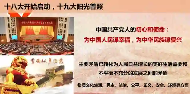 到了十九大召开,那就是阳光普照。党的初心和使命说的是什么呢?是为全中国人民谋幸福,为中华民族谋复兴。后边又说,主要矛盾已经发生了转化,就不仅仅是人民对物质和文化的需求,还有对民主、法治、公平、正义、安全、环境等方面的需求。