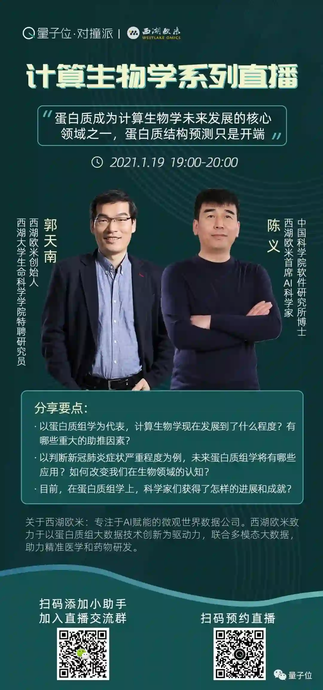 在第一场直播中,我们邀请了西湖欧米的创始人郭天南与首席AI科学家陈义,从蛋白质组学出发,展望计算生物学未来的发展方向与应用。