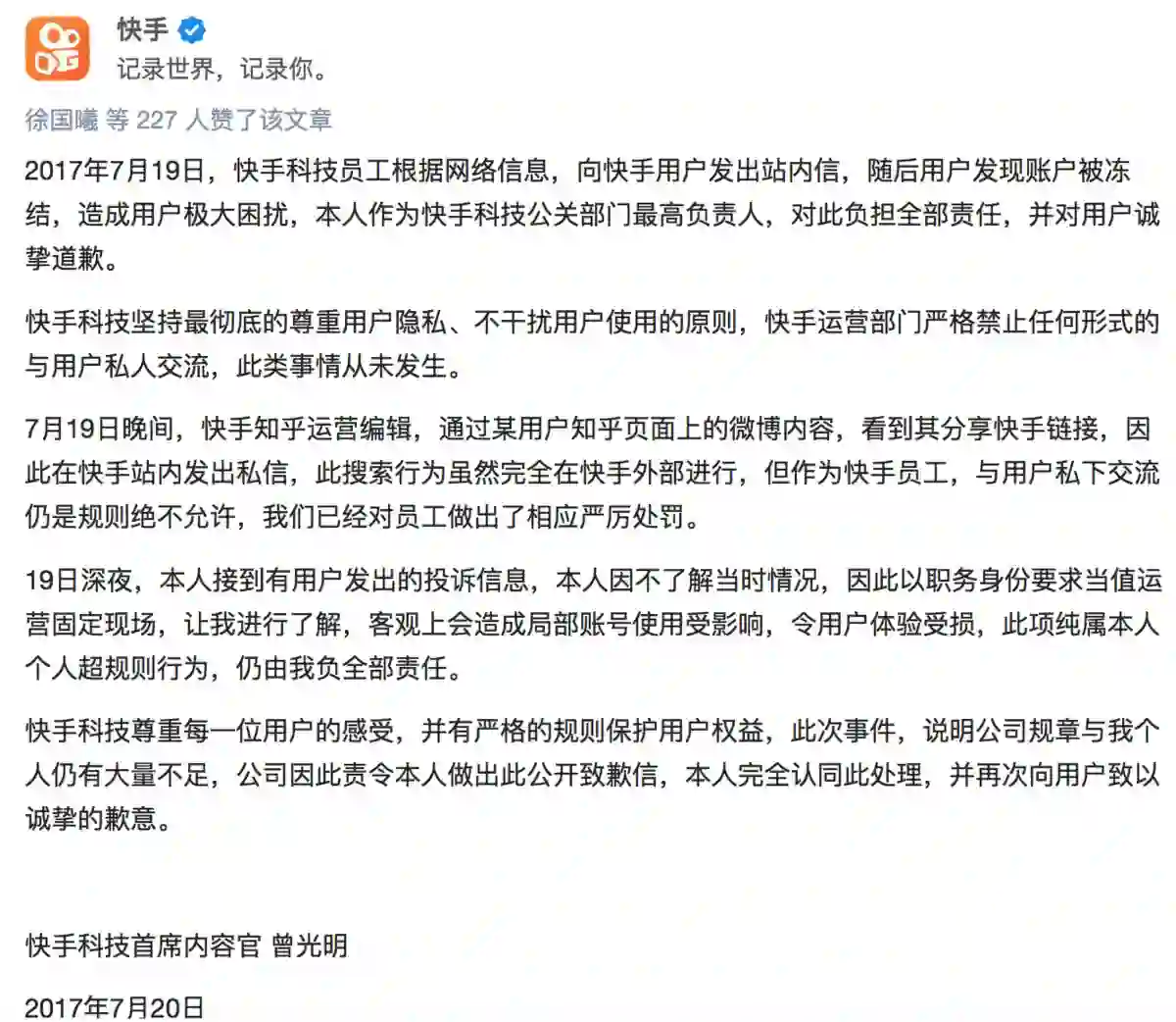 虽然这份回应最后有致歉之意,但是获取用户信息来自公开渠道这一说法并不为知乎网友买账,快手随后又连续两次做出回应。先是称快手员工言论确实“带有个人情绪”,已将涉事员工调离岗位,并就此致歉;后又贴出年前刚加入快手的首席内容官曾光明的致歉信。