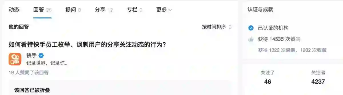 回过头来看快手在知乎机构号上的运营,除了那篇令人落泪的回答点赞超过十万外,其余回答点赞寥寥,关注者更也只有四千多。