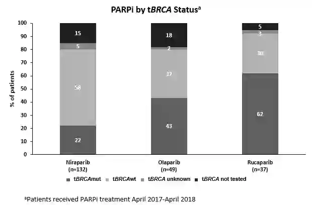 上述数据显示:经PARPi批准,OC患者的tBRCA检测呈上升趋势。Niraparib是最常用的PARPi,在BRCAwt患者中比olaparib和rucaparib更常用。