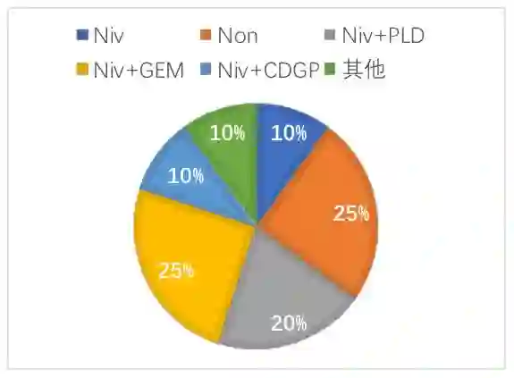 结果:在20例患者中,2例对纳武单抗完全缓解(未应用其他化疗),且完全缓解后没有复发。其余18例则出现疾病进展。其中5例没有化疗,但接受了最佳的支持治疗,其余患者则在应用纳武单抗后接受PLD(n=4),GEM(n=5),CDGP(n=2)及其他化疗。其中2例部分缓解,1例疾病稳定,9例疾病进展及1例未评估。PLD、GEM、CDGP的最佳反应率/疾病控制率分别为50%/50%, 0%/20%, 50%/100%。