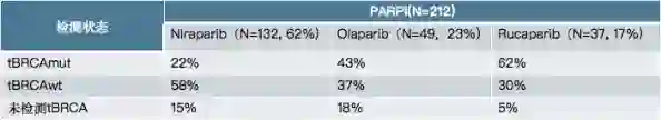 2017年4月至2018年4月,在212例经PARPi治疗的患者中,33%为tBRCAmut, 48%为tBRCAwt, 4%为未知tBRCA, 15%未进行tBRCA检测。在接受PARPi治疗的患者中,62%接受niraparib, 23%接受olaparib, 17%接受rucaparib。