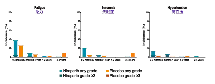 Niraparib维持治疗显示了良好的长期耐受性。血液系统相关AE更频繁地发生在早期,大多数 AE(任何等级和等级≥3肠胃,疲劳和失眠)在前3个月通过剂量调整就可以缓解。血液和胃肠相关AE,疲劳和失眠在3个月后是罕见的。在1年后,≥3级贫血的发生率降低到小于1%。