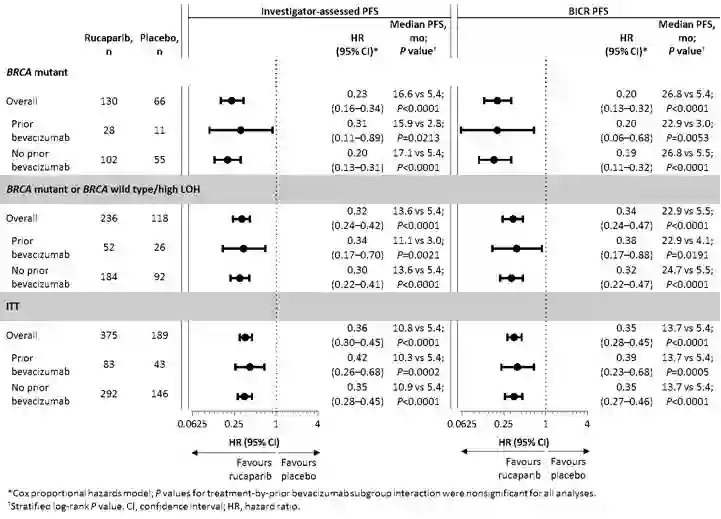 Rucaparib对比安慰剂显著改善了所有患者群体中PFS,且不需要考虑生物标志物的状态。本探索性亚组分析了先前贝伐珠单抗治疗对研究者评估和盲法独立中心评估PFS的影响。曾使用贝伐珠单抗作为上一次治疗或更早治疗的患者允许入组(贝伐珠单抗的使用并不是分层因素)。PFS在3个预定义的队列中进行评估:BRCA突变;BRCA突变或BRCA野生型/杂合子丢失(LOH高);以及意向治疗人群。有效性和安全性数据的截止日期分别为2017年4月15日和2017年8月15日。