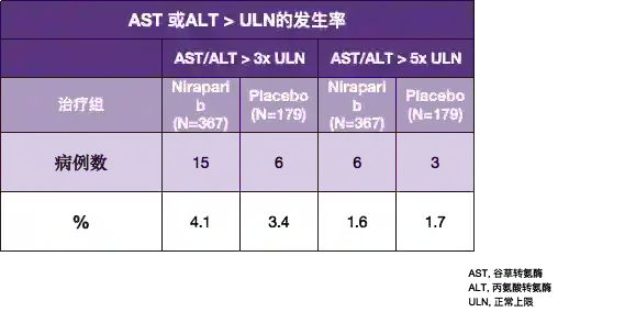 长期耐受性在维持治疗中至关重要。NOVA研究中经Niraparib治疗的相当一部分患者显示出长期应答。经过剂量调整后的Niraparib显示出很好的长期耐受性,包括接受治疗时间大于3年的患者。长期治疗中,Niraparib与安慰剂的TEAEs发生率相似。NOVA研究为Niraparib的剂量个体化方法以及长期安全使用提供了支持依据。
