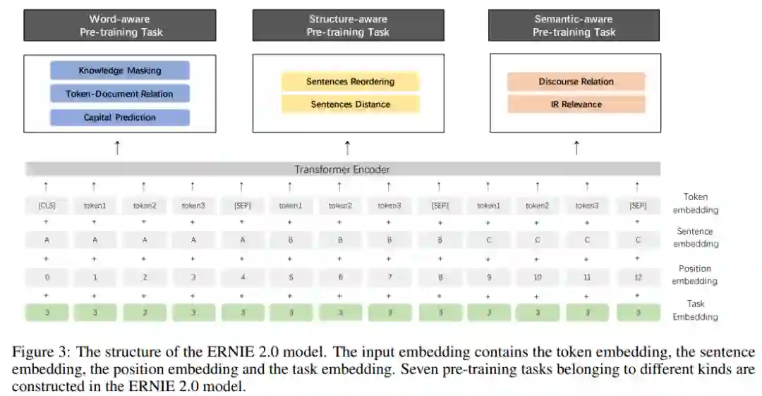 整体框架还是基本跟ERNIE1.0的一样,不过ERNIE2.0为了匹配多任务持续学习的理念,需要在输入的时候额外增加一部分「Task Embedding」,用来告诉模型这是在处理哪个任务。