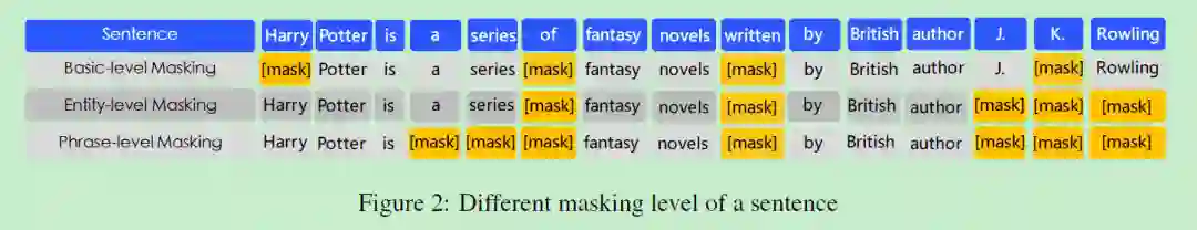 那么怎么样才能使得模型学习到文本中蕴含的潜在知识呢?不是直接将知识向量直接丢进模型,而是在训练时将短语、实体等先验知识进行mask,强迫模型对其进行建模,学习它们的语义表示。具体来说, ERNIE采用三种masking策略: