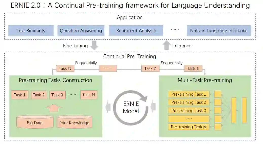 Baidu团队之前发布的ERNIE1.0效果就不错,虽然基础框架沿袭BERT,但是训练语料以及mask策略的改进,使其在中文任务上表现更好。这刚过了几个月,又发布了增强版的ERNIE,最近NLP社区更新速度可见一斑。先前的模型比如ELMO、GPT、BERT、ERNIE1.0、XLNet等都是基于词和句子的共现关系来训练的,这导致模型不能够很好地建模词法、句法以及语义信息。为此,ERNIE2.0提出了「通过不断增量预训练任务进行多任务学习」来将词法句法以及语义信息融入到模型当中去。整体流程如下所示,首先利用简单的任务初始化模型,接着以串行的方式进行「持续学习(Continual Learning)」,对于每次新增的训练任务,模型可以利用之前已经训练过的任务信息去更好地学习新任务,这跟人类的学习方式是一样的。