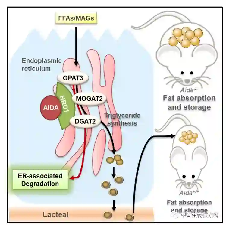 膳食脂肪进入体内后,首先在小肠里水解成脂肪酸和单酰甘油,被小肠上皮细胞摄入,在小肠上皮细胞中又重新合成脂肪,形成脂蛋白并从小肠上皮细胞分泌,而进入淋巴循环并通过血管输送到全身被各个器官利用或储存。而AIDA缺失小鼠中增高的脂肪吸收效率就来源于肠道中脂肪合成途径的数个合成酶的蛋白质水平的上调,促进脂肪酸重酯化减少细胞内的脂肪酸的含量,增加进一步从小肠里吸收脂肪酸。脂肪合成途径的代谢酶大多都定位于内质网。该团队通过机制的研究发现,AIDA缺失导致一种原先认为只调控内质网里的蛋白质质量和数量的途径——内质网降解途径(ERAD)无法降解这些脂肪合成酶,导致其蛋白水平上升。内质网降解途径的抑制剂处理的野生型小鼠的餐后血脂会上升到跟未处理的Aida敲除小鼠相同的水平,而该抑制剂对Aida敲除小鼠则没有作用,这表明Aida敲除和ERAD失效对于餐后血脂有完全一致的效果。在肠道特异性敲除Aida的小鼠中,肠细胞脂肪吸收的速率和血液中脂肪含量的上升速率等表型跟上述全身敲除小鼠非常类似,也表明了肠道中的AIDA在脂肪吸收效率的调控上至关重要。