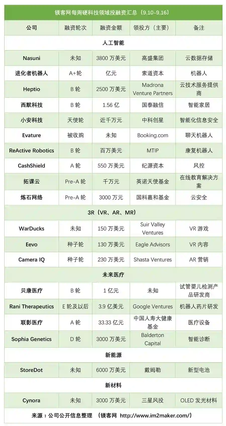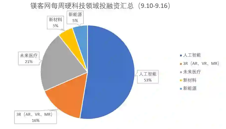 本周(9.10-9.16)硬科技领域内合计公开报道了19起相关的投融资事件,其中还包括人工智能领域内的1起收购,相比较前几周,数量有所下降。