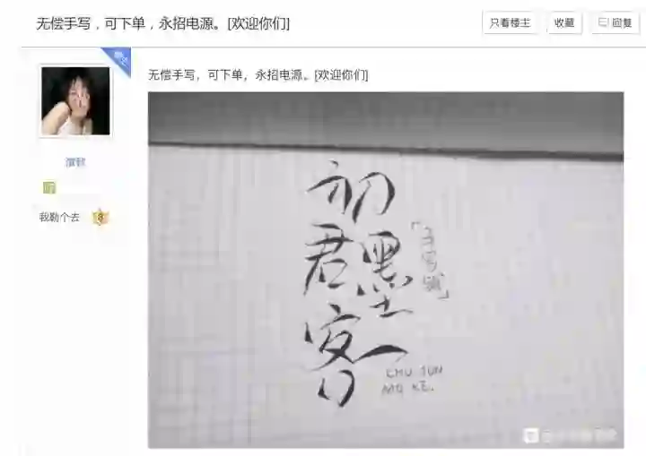 顾客会回帖下单自己想要写的字,然后我用笨拙稚嫩的字体在纸上抄写一遍,最后再用电脑摄像头拍下来回传给顾客。