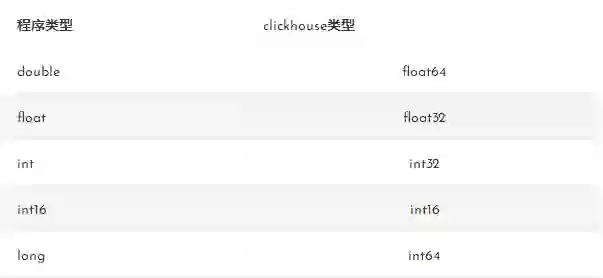 如上问题是由于clickhouse中数据类型为float32,程序中的类型为double就会引起上述问题,附上部分数据类型对应关系: