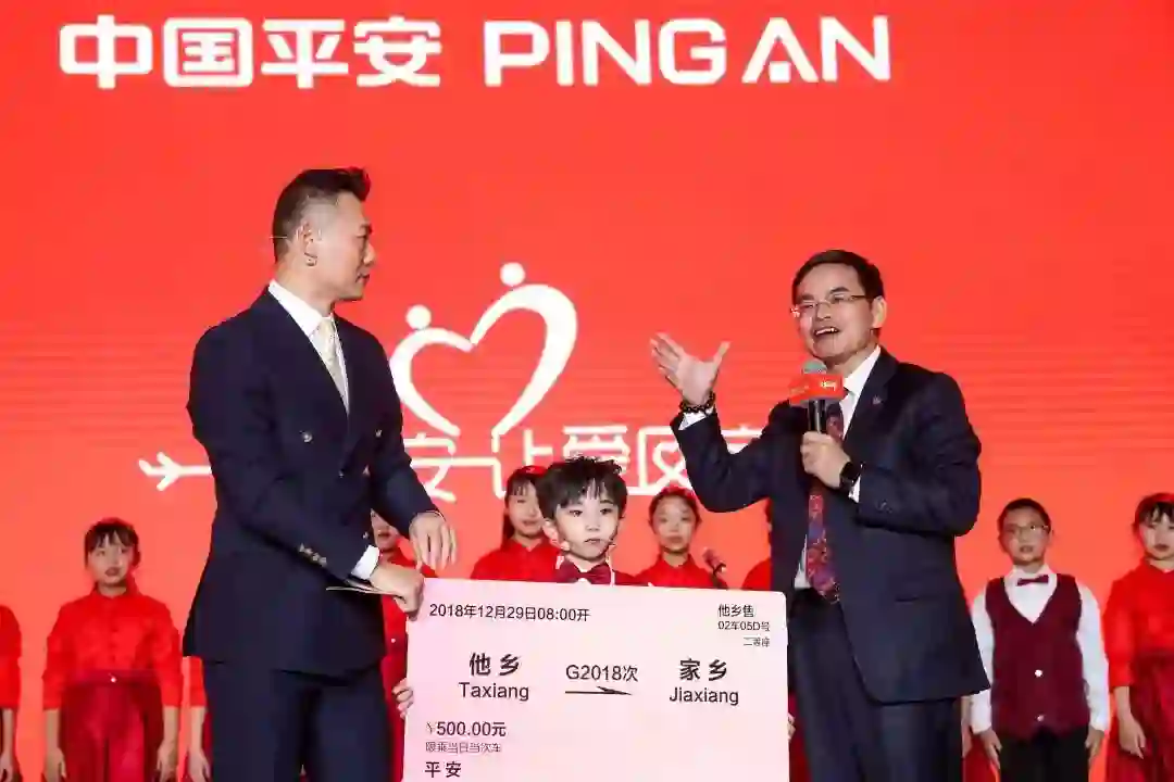 “一路平安•让爱回家”公益活动,帮助外来务工人员获得春节的回家车票。图右为中国平安董事会秘书兼品牌总监盛瑞生、图左为凤凰卫视著名主持人胡一虎。