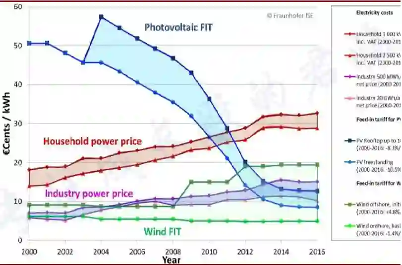 2008年开始德国光伏系统成本大幅下降,此时FiT (Feed-in-Tariff,固定价格收购政策)下调速度却滞后于系统成本,因此从2008年开始到2012年德国新增光伏装机规模大幅增加;