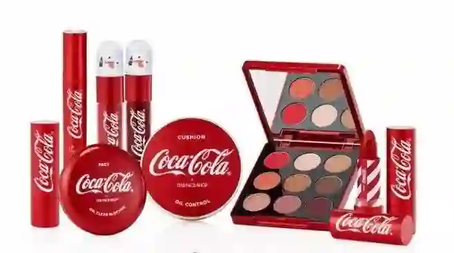 可口可乐与韩国美妆品牌The Face Shop(菲诗小铺)联名推出全系列彩妆。联名款包括9色眼影盘、气垫BB、粉饼、唇膏、唇釉和染唇液六个品类。产品5月初在天猫平台首发,产品价格在59-179元之间。