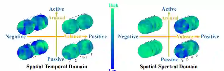 生理信号空间域中的时域信息和频域信息通常具有不同的激活程度。例如,图 1 显示了不同情绪状态下 EEG 信号在空间域中时域和频域特征的差异。例如,在时空域中,时域信息的激活程度直接反映了大脑的活动。高激活度通常与积极情绪有关,低激活度通常与消极情绪有关。在频空域中,𝛾 波段的激活度通常在消极情绪中较高,在积极情绪中较低。
