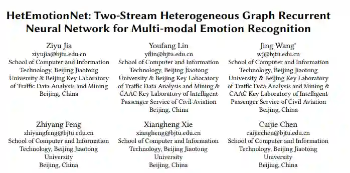 本文介绍一篇于 ACM MM 2021 上发表,备受关注的 Oral 论文《HetEmotionNet: Two-Stream Heterogeneous Graph Recurrent Neural Network for Multi-modal Emotion Recognition》,该论文以多模态情感数据的高精度分类为研究目标,提出了一种双流异质图递归神经网络进行多模态情绪数据的分类。