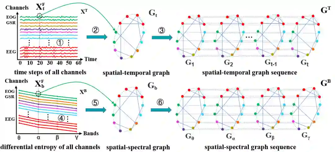 对于每个样本,我们分别构建了一个异质的时空图序列和一个异质的频空图序列,如图 5 所示。这些异质图被用来描述多模态信号时域信息和频域信息在空间上的分布。我们主要分成以下三个步骤来构建时空图序列: