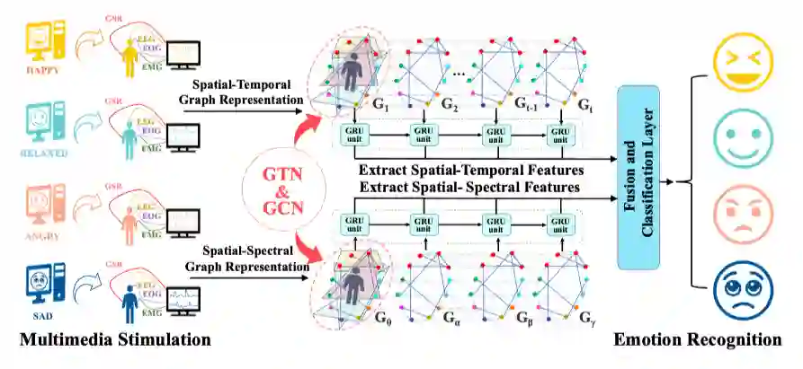 本文提出了一种多模态情绪识别模型 HetEmotionNet。该模型使用基于图的双流结构同时捕获多模态生理信号的时-频-空三类特征;同时该模型利用了 GTN 来建模多模态生理信号的异质性,GCN 来建模多模态生理信号的相关性并用 GRU 来提取多模态生理信号时域和频域间的依赖关系。在公开的多模态情绪识别数据集 DEAP 与 MANODB-HCI 上的实验表明,该模型有着出色的性能并优于基线方法。