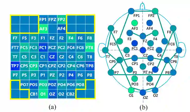 ▲ 图2:两种EEG通道的空间表示。(a):将EEG信号组织成2D map形式。(b):将EEG信号组织成图的形式
