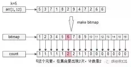 接下来,找TopK的过程,就是bitmap从高位的计数开始,往低位的计数扫描,得到count之和等于k,对应的bit就是TopK所求。