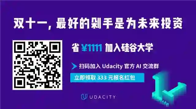 Udacity 还非常本地化的推出了双十一活动,11.1-11.11期间报名最高可享 ¥1111 优惠,席位有限、抢完即止。如果你是也是 AI 热爱者,欢迎扫码以下二维码加入 Udacity 官方 AI 交流群,获得来自硅谷的深度学习/机器学习就业指南,还可以领取 333 元无门槛红包,与其它双十一优惠叠加使用。