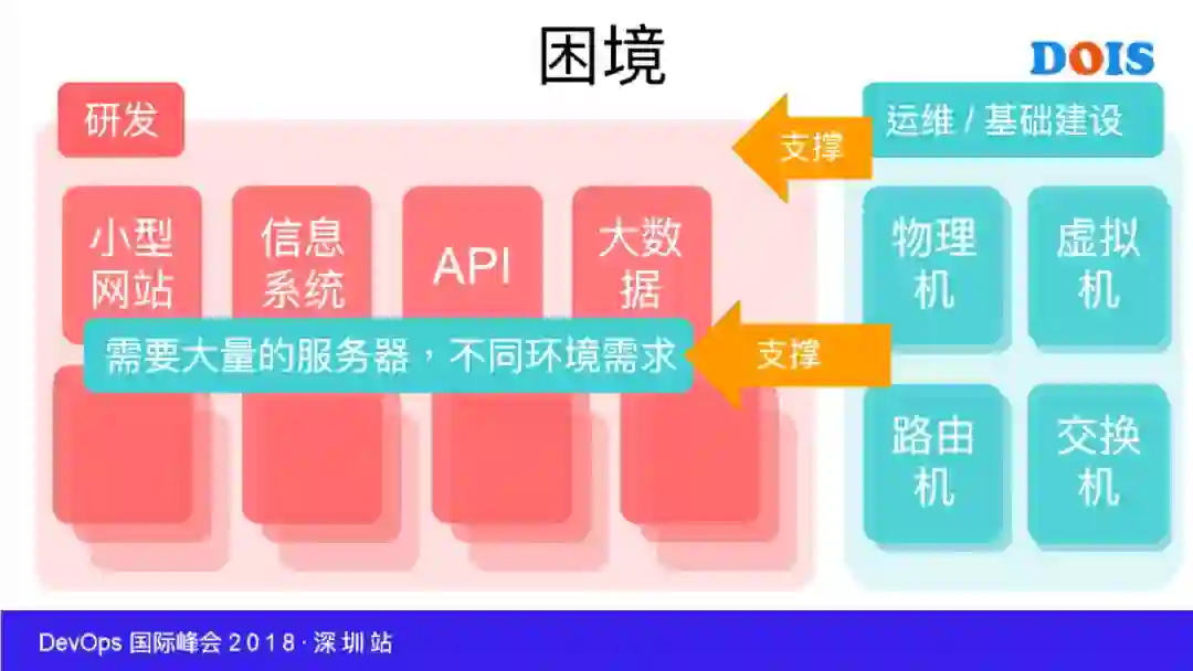 在这样的情况下基础建设有什么样的困境呢?同时拥有物理机,虚拟机,路由机,交换机,所以基础建设会遇到机器如何管理的问题。