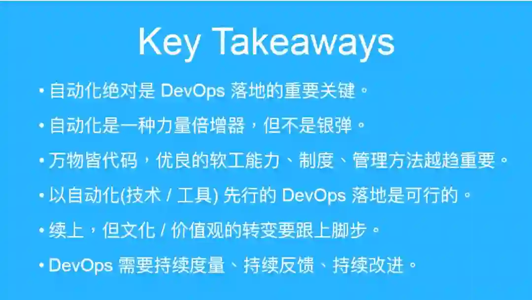 因为有些超时了,快速的总结一下,自动化绝对是DevOps落地的重要关键,绝对是可行的,但是自动化落地之后,工具落地之后相对的文化、价值观也必须要跟上,并需要持续的度量、反馈以及持续的改进才行。今天就分享这些内容,谢谢大家。