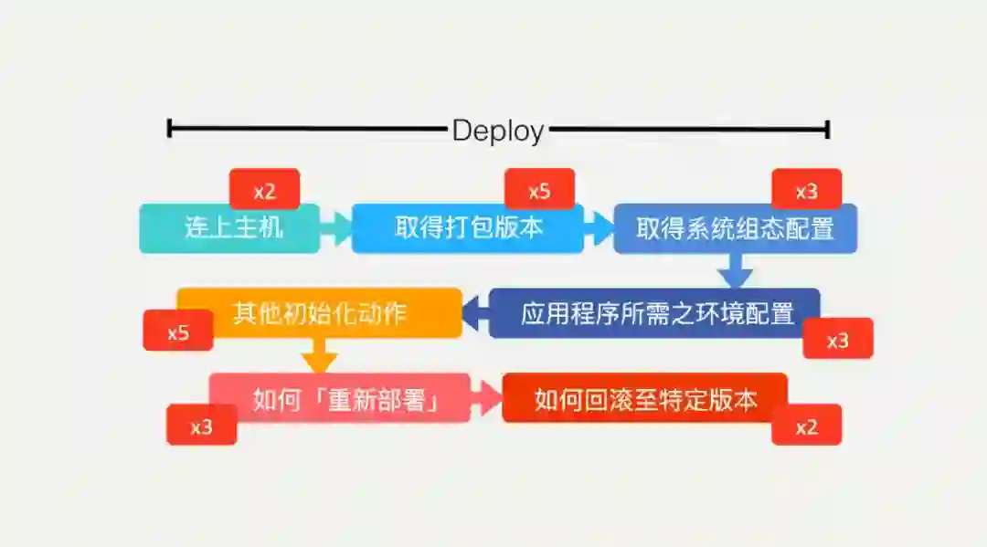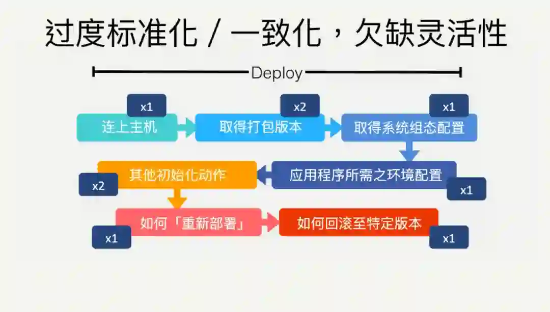 误区还有就是丧失灵活性,假设这是一个简单部署的流程,有非常多的环节可能需要思考的,要连上主机,取得打包版本,取得系统组态配置,一些环境初始化的动作,应用程序所需之环境配制,如何重新部署,如何回滚至特定版本,这个步骤可不可以重新部署,这些叠加起来是非常复杂的状况,在做自动化平台的时候,要先做标准化,甚至要先做规范化,标准化规范化之后很多东西都被固定下来了,所以丧失了很多灵活性。