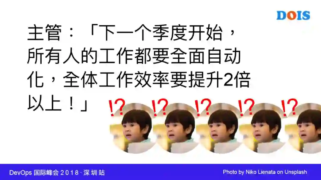 在这种状况下前面这个段子真的就会出现,而且会非常惨,老板会要求你不只做两倍,而是要五倍或者十倍。他只想看到你的成效,而不会认为 DevOps 不只是一种工具,是影响组织全面的组织变革。