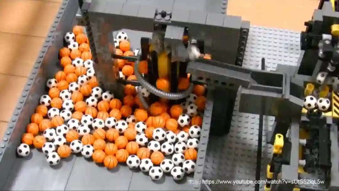这是另外一个工程师,就连要玩积木,也不正常的玩,这其实是非常厉害的结构,全自动的,前面会有机器自动把这个球吸附上来,然后送入一个流水线,最后球又会回到起点,不断自动的重复这个流程。