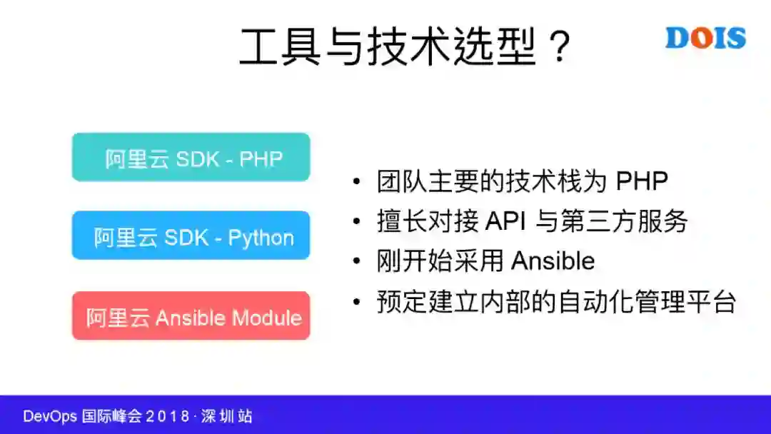 在这样的情况之下,有三个选项,你会选用阿里云的 SDK-PHP,或者说阿里云SDK-python,还有就是阿里云的 Ansible Module,你会选哪一个呢?