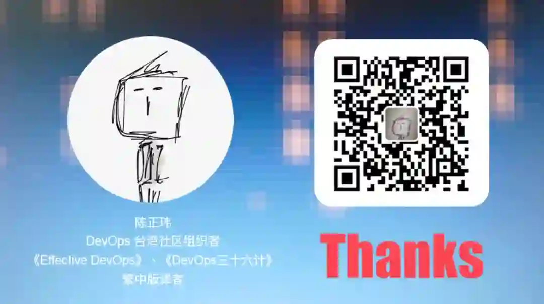 陈正玮,来自台湾,台湾得宽科技 DevOps 工程师,在台湾负责翻译《Effective DevOps》,以及《DevOps 三十六计》简中转繁中,三十六计繁中版预定年底会上市。同时也是台湾DevOps社区其中一位组织者,非常期待能够在两岸多做一些技术的交流。
