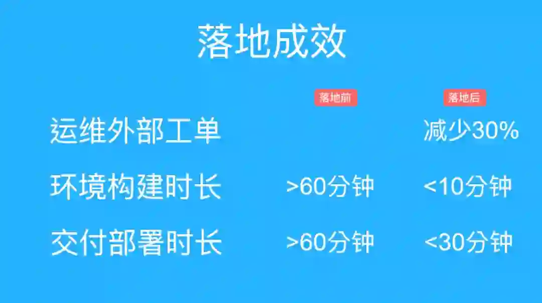 还有就是环境构建时长,之前都是大于60分钟,经常会打电话来催促,但是有了自动化之后10分钟就可以搞定了,交付部署时长也是很长时间,大于60分钟,但是有落地完成后变成了30分钟,变得更加的有效率了。
